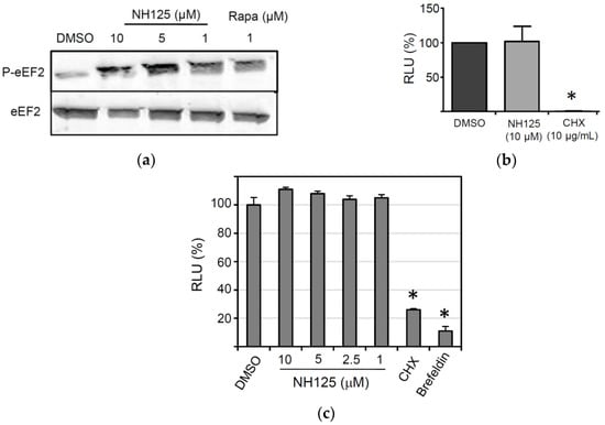 NH125 has previously been described to act as an inhibitor of the eukaryotic elongation factor 2 (eEF2) kinase, a calmodulin-dependent kinase that inactivates eEF2 through phosphorylation of threonine at position 56 []. However, there is also evidence showing that NH125 actually promotes phosphorylation of eEF2 [,]. To study the effect of NH125 on eEF2 phosphorylation, HeLa cells were treated with NH125 for 8 h before the cell lysates were analyzed by Western blot. We observed that NH125 increased phosphorylation of eEF2, but had no apparent effect on the overall eEF2 content if used at 5 µM or lower concentrations (Figure 4a). Rapamycin, which has previously been shown to induce phosphorylation of eEF2 [,], was used as a positive control (Figure 4a). To address if NH125 has any impact on protein synthesis, an in vitro translation assay was performed. Rabbit reticulocyte lysates were pre-incubated with either NH125 (10 µM), cycloheximide (CHX, 10 µg/mL) or DMSO (0.1%, v/v) for 2 h before addition of in vitro transcribed and capped mRNA encoding luciferase. We found that NH125 did not inhibit the translation of luciferase mRNA (Figure 4b), suggesting that the antiviral properties of NH125 did not rely on the inhibition of protein synthesis. Next, we tested whether NH125 would affect plasmid-driven expression of a reporter protein. To this end, we transfected BSR-T7/5 cells, a cell line constitutively expressing the T7 phage RNA polymerase [], with pTM1-sNLuc, a plasmid encoding the sNLuc gene under control of the T7 promotor and an internal ribosome entry site from the encephalomyocarditis virus. Six hours post transfection, the cells were washed to remove all sNLuc which has been secreted until this time, and subsequently incubated the cells for 18 h with either NH125, cycloheximide or brefeldin A. Analysis of the cell culture supernatant revealed that NH125 did not affect the expression of the reporter protein (Figure 4c), in striking contrast to cycloheximide, a drug affecting protein synthesis, and brefeldin A, a compound disturbing the integrity of the secretory pathway []. Together, these findings suggest that NH125 does not interfere with cellular protein synthesis nor does it inhibit protein secretion.