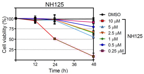 In order to assess the impact of NH125 on cell viability, the release of a protease from dying cells was determined taking advantage of a luminescent protease substrate. NH125 did not reveal cytotoxic effects at any concentration when incubated with BHK-21 for 12 h (Figure 6). However, NH125 killed about 50% of the cells if present for 24 h at a concentration of 10 µM and further reduced cell viability when inoculated with the cells for 48 h. When NH125 was used at concentrations below 10 µM, no cytotoxic effects were observed up to 24 h. However, some cell death was caused by low-concentrated NH125 when the drug was present for 48 h. For comparison, chloroquine also caused cell death in a concentration- and time-dependent manner (Figure S2), indicating that lysosomotropic drugs may interfere with cell viability if used for a prolonged time at too high a concentration. In line with our observations, the cytotoxicity of N-dodecylimidazole has also been ascribed to the lysosomotropic features of this NH125-related compound [,,].