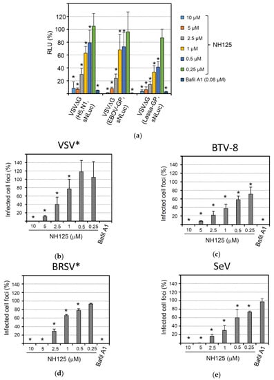 Broad-spectrum antiviral activity of NH125. BHK-21 cells were treated for 1 h with the NH125 using the indicated concentrations or with bafilomycin A1 (0.08 µM). (a) The cells were inoculated for 1 h with the indicated chimeric viruses (m.o.i. of 0.05 ffu/mL) in the presence of the inhibitor, washed and maintained in medium for five more hours. Secreted NanoLuc luciferase activity in the cell culture supernatant was determined with a luminescent substrate. The relative luminescence with respect to DMSO-treated control cells is shown. Mean titers and standard deviations of six parallel experiments are shown. (b–e) NH125-treated BHK-21 cells were inoculated for 1 h in the presence of inhibitor with 100 ffu/well of either VSV* (b), BTV-8 (c), BRSV* (strain ATue51908) (d), or Sendai virus (SeV, strain Fushimi) (e). The cells were washed and maintained for 20 h in medium with inhibitor and methylcellulose. The number of infected cell foci was determined and expressed percentage infected cell foci relative to DMSO-treated cells. Mean titers and standard deviations of 6 parallel experiments are shown. Asterisks indicate significantly reduced number of cell foci compared to the DMSO control.