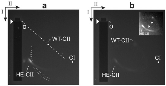 The effective radius of a particle (RE), together with the radius of the gel’s effective pore (PE), uniquely determine the straight line drawn from the effective origin to the position of a particle in the gel. This line (dashed) is indicated for the WT-CII position in Figure 3a (RE = 28.6 nm by small angle X-ray scattering [40]). The angle, θ, decreases as RE increases [26]. Thus, the particles of the HE-CII band are confirmed in Figure 3a to be relatively large. The shape and orientation of HE-CII band indicate that these particles are also heterogeneous in RE.