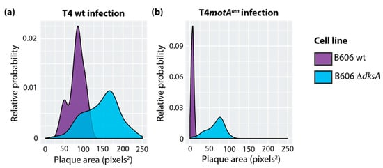 T4 infections in the absence of DksA produce larger plaques. Density plots of plaque size for B606 wild type (wt; purple) and B606 ∆dksA (blue) infected with either T4 wt (a) or T4motAam (b). Plots shown represent one of three biological replicates.