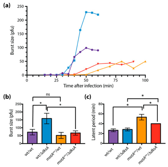 Absence of DksA increases the burst size of a T4 wt infection and decreases the latent period of a T4motAam infection. (a) Representative graph of burst size vs. time after infection; (b) burst size, and (c) latent period for infections of T4 wt/B606 wt (purple), T4 wt/B606 ∆dksA (blue), T4motAam/B606 wt (orange), and T4motAam/B606 ∆dksA (red). Averages with indicated standard deviations were determined as described in Materials and Methods from three independent replicates. (The error bar on motAam/∆dksA is too small to be visible.) Asterisks (*) indicate significance as determined by an unpaired t test with a p value ≤ 0.05. The apparent 5 min difference in latent period of the wt/wt and wt/∆dksA infection shown in (a) is not statistically significant (see panel (c)).