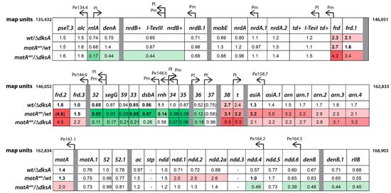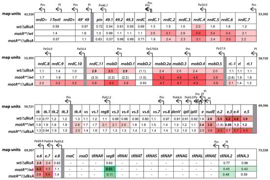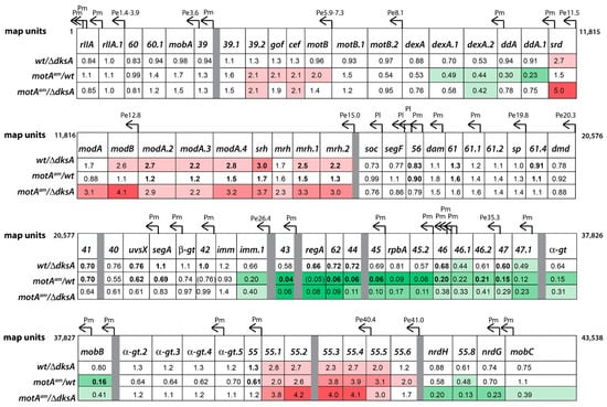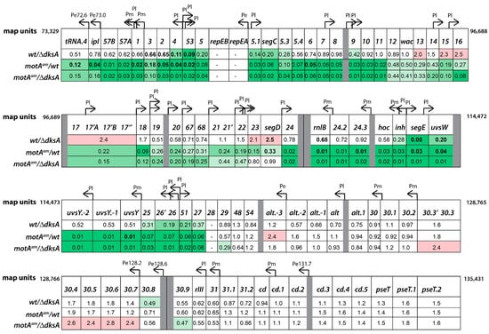Genomic map of bacteriophage T4 correlated with gene expression data from RNA-seq. Graphical representation of the T4 genome showing the location of annotated genes and promoters as given in [53]. The fold changes from the RNA-seq analyses determined for infections of T4 wt/B606 dksA (wt/dksA), T4motAam/B606 wt (motAam/wt), and T4motAam/B606 ∆dksA (motAam/dksA) compared to T4 wt/B606 wt are indicated. Gene expression changes are color coded as: increasing expression ≥2.0 with increasing red intensity; no significant change, white; decreasing expression ≤0.5 with increasing green intensity. Values of genes whose expression was checked by real-time quantitative polymerase chain reaction (RT-qPCR) are given in bold; any value that was tested in RT-qPCR analyses but was not consistent is given in parenthesis. Genes without an indicated value had less than 50 mapped reads in all the RNA-seq data samples. The genomic coordinates (map units) for each region are listed at the start and end of that row of genes.