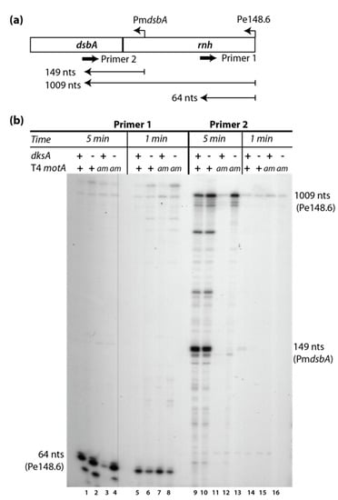 RNA from Pe148.6, which is significantly reduced in a T4motAam infection of B606 wt at 5 min post-infection, is rescued by a deletion of DksA. (a) Schematic showing T4 map units from 150,727 to 149,509 containing genes rnh and dsbA with the relative positions of the early promoter Pe148.6 and the middle promoter PmdsbA and the primers used for primer extension analyses. Sizes of the expected primer extension products are indicated in nts; (b) Representative gel showing the primer extension products from primers indicated in panel (a). RNA was isolated from T4 wt (+) or T4motAam (am) infections of strain B606 wt (+) or B606 ΔdksA (−) at 5 or 1 min post-infection.