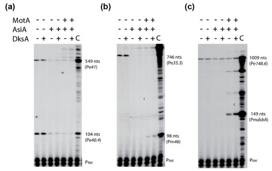 Presence of DksA has no effect on transcription from various T4 Pe’s in vitro. Representative gels show primer extension products for Pe40.4 (a), Pm46 (b), and PmdsbA (c) arising from in vitro transcription of T4 wt DNA in the presence of DksA, MotA, and/or AsiA, as indicated. Each primer extension reaction also contained Ptac RNA and its primer as an internal control. In vivo RNA isolated from a T4 wt infection of B606 wt at 5 min post-infection was used as a positive control for each primer (labeled as lane C). The lengths of primer extension products are indicated in nt.