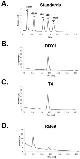 Monosaccharide composition analysis by high-pH anion exchange chromatography with pulsed amperometric detection (HPAEC-PAD). (A) monosaccharide standards; (B) hydrolysate of DDY1 sample; (C), hydrolysate of T4; and (D) hydrolysate of RB69 DNA sample. Abbreviations used: GalN, galactosamine; GlcN, glucosamine; Gal, galactose; Glc, glucose; Man, mannose.