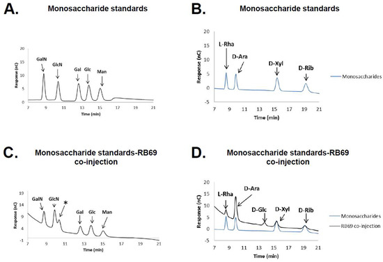 High-pH anion exchange chromatography of monosaccharide standards and RB69 DNA hydrolysate. HPAEC chromatograms of (A,B) monosaccharide standards and (C,D) co-injection of monosaccharides with RB69 DNA hydrolysate. Abbreviations used: GalN, galactosamine; GlcN, glucosamine; Gal, galactose; Glc, glucose; Man, mannose; *, Unidentified sugar; l-rha, l-rhamnose; d-Ara, d-arabinose; d-Xyl, d-xylose; d-Rib, d-ribose.