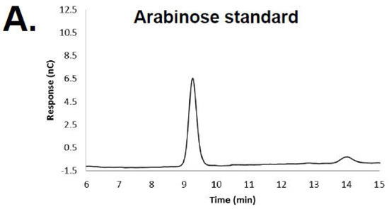 High-pH anion exchange chromatography of arabinose standard and RB69 DNA. HPAEC chromatograms of (A) arabinose standard, (B) RB69 DNA hydrolysate, and (C) co-injection of arabinose standard and sample RB69 DNA hydrolysate.