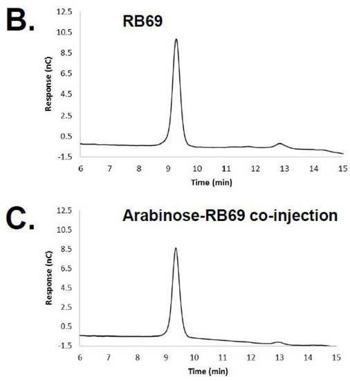 HPAED-PAD was repeated again on a RB69 DNA hydrolysate including the co-injection of the hydrolyzed RB69 DNA with the monosaccharide controls and the additional monosaccharide standards l-rhamnose, d-arabinose, d-xylose, and d-ribose (Figure 2). Comparison of the hydrolyzed RB69 DNA sample, including its co-injection with the monosaccharide standards, showed that the RB69 peak directly co-migrated with that of d-arabinose, suggesting that RB69 DNA is likely glycosylated with d-arabinose (Figure 2). To confirm this observation, a fresh sample of RB69 DNA underwent hydrolysis and HPAED-PAD repeated with just the arabinose standard, again showing the RB69 peak to directly co-migrate with that from the arabinose standard (Figure 3).