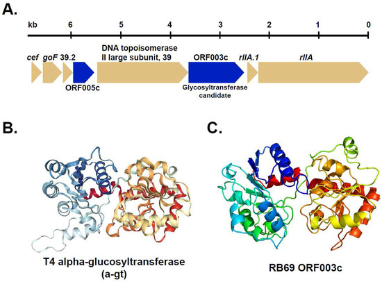 Phage RB69 arabinosyltransferase candidate ORF003c. (A) Region of the RB69 genome encoding the putative arabinosyltransferase gene ORF003c. Genes with homologs in T4 are shaded light brown and genes unique to RB69 are shaded dark blue (B) Structure of the T4 a-gt (PDB 1XV5) and (C) predicted structure of RB69 ORF003c by Phyre2 (intensive mode).
