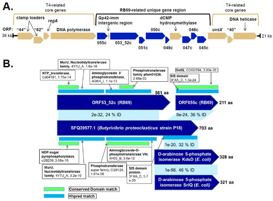 Our searches revealed that the GutQ annotations of the Butyrivibrio proteins were likely the consequence of strong matches between their C-termini and the conserved cl00389 SIS (Sugar ISomerase) domain (e.g., 5.13e-41 for that of B. proteoclasticus strain P18 (SFQ39577.1)). This was also supported by a Blast2seq BlastP match between SFQ39577.1 and the proteome of E. coli strain K-12 substr. MG1655 (U00096.3) which identified the two diverged homologs KdsD (1e-20, 32% identity) and SrlQ (2e-15, 31% identity) over ~170 residues on the C-terminus of SFQ39577.1. KdsD and SrlQ are known paralogs and both are annotated as d-arabinose 5-phosphate isomerases based on the biochemical analyses of SrlQ, also known as GutQ, which was shown to catalyze the reversible aldol-ketol isomerization between d-ribulose 5-phosphate and d-arabinose 5-phosphate [36,37]. As the match between the B. proteoclasticus SFQ39577.1 protein and ORF53_52c did not extend to this C-terminal SIS-like domain, we sought a counterpart to this region in RB69. A BlastP search identified the product of a gene upstream to ORF53_52C, the 211 residue ORF055c, as a homolog to this domain (Figure 6). Based on the divergence of the matches between the B. proteoclasticus protein SFQ39577.1, and its characterized E. coli homolog, as well as its counterparts in RB69, further research is required to clarify the functions of these novel proteins. However, based on the fact that RB69 ORF055c and ORF53_52 have domain matches that link them back to an enzyme that recognizes arabinose, and that RB69 has a confirmed ara-hmC modification, we speculate that these proteins are excellent candidates for having a role in the generation of UDP-arabinose that would be required for the formation of ara-hmC. In addition, the genes encoding these RB69 proteins are in a gene module containing eight genes that have no homologs in T4, located between the DNA polymerase and UvsX genes (Figure 6)—a region shown to have a high degree of plasticity in T4 phages. For instance, the T4 b-gt and homing nuclease SegA genes are located between its dCMP hydroxymethyltransferase and UvsX genes. Notably, several phages with homologs to the putative RB69 arabinosyltransferase ORF003c, such as E. coli phage JS09 and Shigella phage Shf125875, have counterparts to the RB69 gene region that includes the highly unusual ORF055c and ORF53_52c genes that may be involved in UDP-arabinose synthesis.