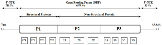 Like other picornaviruses, EV-A71 contains single-stranded positive RNA (+ssRNA) which is contained within the non-enveloped capsid of the virus [12]. The RNA genomic sequence is made up of 7411 base pairs and has an open reading frame (ORF) flanked on both ends by the 5′ Non-Translated Region (5′-NTR) and the 3′ Non-Translated Region (3′-NTR) [13]. The 5-NTR has an internal ribosome entry site (IRES) which controls cap-independent translation. The ORF comprising 6579 nucleotides can be classified into three polyprotein regions, namely, P1, P2 and P3. They encode for structural proteins (VP1 to VP4) in the P1 region and non-structural proteins in the P2 (2A-2C) and P3 regions (3A-3D) following proteolytic cleavage (Figure 1) [5]. The viral capsid proteins VP1, VP2 and VP3 are displayed on the external structures of the EV-A71 viral particle whereas VP4 is found within the internal structures of the capsid. The 2A and 3C proteins are of particular interest as they are crucial for viral-host interactions, viral replication and apoptosis. As for the 3D polymerase of a +ssRNA virus, it is an RNA-dependent RNA polymerase (RdRP) with low fidelity, having as many as 10−3 to 10−5 mutations per nucleotide copied in each replication cycle, and this could result in misincorporation of 1–2 new nucleotides. [14,15].