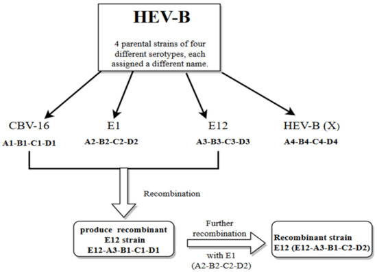 Illustration showing the two events of recombination of HEV-B (CBV16, E1, E12 and X) using similarity plots. CBV-16, E12, E1 and X refer to the designated names of four ancestral strains of four different serotypes. The white arrows indicate the recombination events between the two ancestral strains (CBV-16 and E12) and further recombination with E1.
