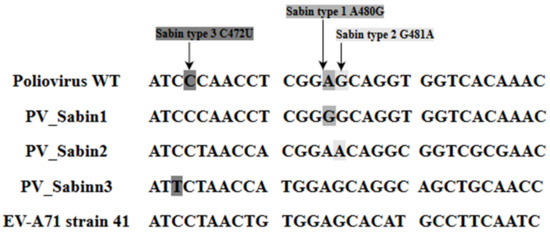 Comparison of the nucleotide sequence between the Wild Type Poliovirus, Poliovirus Sabin Strain 1, 2 and 3 and EV-A71 strain 41(GenBank: AF316321). PV Sabin 1, PV Sabin 2 and PV Sabin 3 contain altered nucleotides in the 5′-NTR of ssRNA. Shaded areas in different shades of grey indicate the location where the altered nucleotides are.