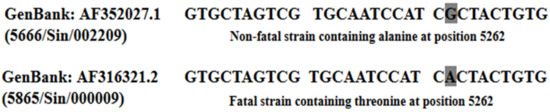 Comparison of a fatal (AF316321.2) and a non-fatal (AF 352027.1) strain isolated from the HFMD outbreak in Singapore (2000). Highlighted in grey shows the difference of a single nucleotide (A) was observed at nucleotide position 5262 (amino acid residue 1506) in the 3A non-structural region of the fatal strain [50].