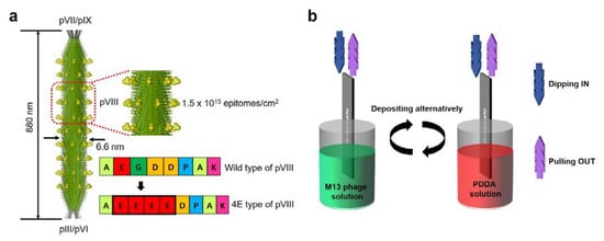 - Yoo, P.J.; Nam, K.T.; Qi, J.; Lee, S.K.; Park, J.; Belcher, A.M.; Hammond, P.T. Spontaneous assembly of viruses on multilayered polymer surfaces. Nat. Mater. 2006, 5, 234–240. [Google Scholar] [CrossRef] [PubMed]