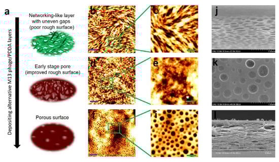 PDDA films were then deposited in an alternating manner on the M13 phage layers. At this point, the role of PDDA layers was to reduce the surface roughness of previous M13 phage layers. Notably, uneven gaps created by poor surfaces in the network structures ranged from about 1 to 3 µm. These gaps in the layers were gradually filled by depositing PDDA layers, and when around six layers had been deposited, early stage pore formation was observed (Figure 2d,e) with better surface quality. The surface roughness was now ~37 nm, which is an improvement of about 50%. However, at this stage, a few surface nanopores with diameters of about 700–1200 nm (±20 nm) and depth of ~70–80 nm (±5 nm) were evident. Further depositions of M13 phage and PDDA layers improved surface quality and induced the formation of pores with decreasing diameters and depths. Clear porous surfaces were seen after depositing the eighth layer. The porous surfaces eventually formed by the 10th layer are shown in Figure 2f,i. Pore diameters ranged from ~150 to 500 nm (±20 nm) and depths from ~15 to 30 nm (±5 nm) in the 10th layer. The surface quality of the final layer improved by about 80% when compared with the first layer (surface roughness of ~14 nm). This porous surface information was well supported by the perspective (Figure 2j) and surface view (Figure 2k) of the SEM images. After 10 layers, clear porous structures were observed with diameters ranging from ~150 to 500 nm. The total thickness of the 10-layered bio-film was ~3.84 µm (SEM cross-sectional view, Figure 2l).