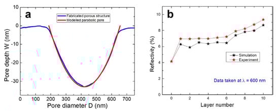 where D and W are pore diameter and depth, respectively (Figure 3a). At λ of 600 nm, no absorbance issues were observed for the glass substrate, M13 phage, or PDDA layer. This wavelength data will help analyze the reflectivity, as no other complex optical information is related to these three materials. Figure 3b shows the simulated and measured reflectivity data as function of layer number. Layer number 0 corresponds to the glass substrate. The reflectance of 4.2% is typical of glass substrates, and this well-matched the experiment and simulation results. From layer numbers 1 to 6, almost no difference was observed in reflectance data. At layer 1, a poor surface morphology increased the reflectance to ~6.5%, and up to layers 5 or 6, similar reflectance values were recorded. Furthermore, this reflectance concurred with experiment results, with average reflectance values of ~7% being measured for layers 1–6. Significant reflectance changes were observed from layer 7 to 10. At this point, the influence of the porous surface played crucial role. Reflectance values increased from ~7% to ~9%, due to the presence of porous nanostructures in the surface. For a 10-layered biofilm, ~8.7% reflectance was obtained via simulation. Experimental data showed a similar trend for reflectance values and a maximum value of ~9.5% was recorded for a 10-layer biofilm. This linear increase in reflectivity values can be explained using a solid immersion lens (SIL) structure. Our pores were shaped like an inverted SIL, which is parabolic shaped [54]. For pores with larger diameters and depths, light could be more easily transmitted, comparatively. With these dimensions, internal diffraction and reflection can be minimized resulting in a smaller reflectance value. At smaller pore dimensions (smaller diameter and depth), contributions from internal diffraction and reflections increase, resulting in an increase in reflectivity. These optical properties aligned well with our simulation and experimental results and support the proposed fabrication mechanism responsible for surface pore formation arising from initially poorly deposited layers and the presence of randomly distributed network-like structures. This approach opens an interesting path for the fabrication of self-assembled porous multilayer biofilms.