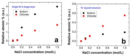 To investigate potential applications of the M13 phage and PDDA laminated nanoporous structure as a functional filter, we examined its ability to extract ions from sodium chloride (NaCl) solution. For this purpose, two types of films were tested: a M13 phage only film and a M13 phage-PDDA multilayered nanoporous film. Figure 4a,b show the relative atomic ratios of the captured ions at different NaCl solution concentrations for the two films. In the absence of a PDDA layer, Na+ ions were captured more effectively by the negative charges of M13 phages. However, in the M13 phage-PDDA multilayer biofilms, a larger number of Cl− ions were captured by the positively charged PDDA. Although the laminated structure consists of the M13 phage, Na+ ions that permeated into pores and bound to virus layers were not detected because of the limited skin depth of the XPS system. This result indicates that Cl− ions bound effectively to the positive charges of PDDA in the multi-layered biofilm. Eventhough the capture ratio of the Cl− ions was smaller at this time, further improvements will be performed in the near future. Problems arise when performing selective ion extraction experiments on a single-layered PDDA film. The success rate of PDDA film attached to the substrate when dipped into NaCl solution was ~ < 1%. Thus, we believe the ten layered biofilm is far better way to proceed. Finally, our results confirm that multi-layer biofilms with a nanoporous structure can act as membranes for selective ion extraction.