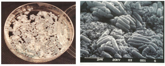 Observation of entrapped alginate bacteria. (Left) Visual appearance of alginate beads containing Listeria ivanovii WSLC 3009 (108 Colony Forming Unit (CFU) mL−1) in a Petri dish. (Right) Scanning electron micrograph of L. ivanovii WSLC 3009 immobilised in alginate beads (×10,000).