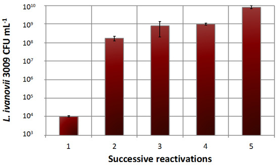 Transfers of Listeria ivanovii WSLC 3009 immobilised cells in fresh Trypticase soy broth (TSB) medium. Each reactivation was followed by an interval of 12 h. Bacterial concentrations were measured after 12 h of growth at 30 °C. Mean values were calculated from two independent experiments, and error bars correspond to standard deviations.