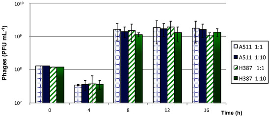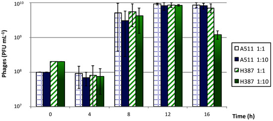 Phage productions in liquid medium were performed with both phages individually (Figure 3). All phage productions were characterized by a lag phase for the first 4 h, followed by a sharp increase in phage titers at 8 h. Maximal phage titers were close to 1010 PFU mL−1 of medium after 12 h. Very small variations in phage titers were observed at different MOIs. After 16 h, the titer of phage H387 decreased when using a 1:10 ratio. It is unclear at this time what caused this decrease in the phage titer, but it could have been due to phage adsorption to cell debris.