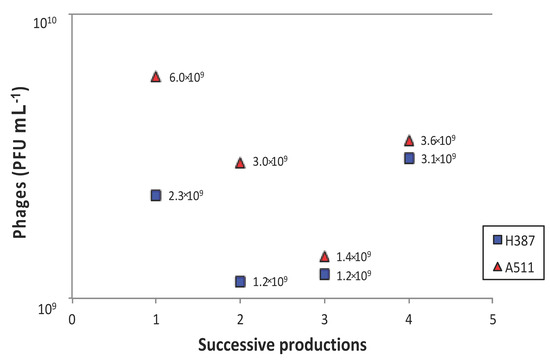 Two advantages of using gel-entrapped cells to produce virulent phages are that phage particles can be easily recovered by draining the culture medium (followed by centrifugation and filtration) and that phage propagation can be immediately resumed or pursued after a short or prolonged storage period. The same alginate beads with immobilised L. ivanovii cells were used for four successive phage productions. In all cases, phage titers were maintained at over 109 PFU mL−1 after the four productions (Figure 5). In general, the final phage titers of the virulent phage A511 were higher than for phage H387.