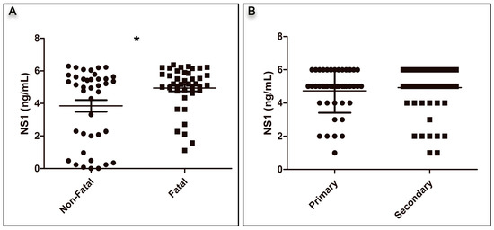 No differences were observed in the NS1 antigenemia of the different DENV serotypes between the types of infection (primary and secondary). The DENV-1 primary fatal cases had an average NS1 antigenemia of 4.80 ng/mL, and the secondary fatal cases had an average value of 5.66 ng/mL (p = 0.248). When DENV-2 fatal cases were analyzed by immune response, also no differences in the average of NS1 levels were observed (3.60 ng/mL and 3.30 ng/mL, respectively, p = 0.816). DENV-3 primary fatal cases had an average of 5.04 ng/mL of NS1, while the secondary fatal cases had a value of 5.16 ng/mL (p = 0.682). Because of an inadequate sample volume, only two DENV-4 fatal cases could be characterized according to the patient’s immune response, and the mean NS1 level was 5.50 ng/mL.