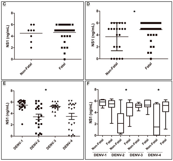 In DENV-2 and DENV-4 fatal cases, the NS1 levels were significantly higher than those observed in non-fatal cases (p = 0.013 and p = 0.018, respectively, Figure 1F, Table 2). Furthermore, despite the high NS1 levels observed in DENV-1 and DENV-3, no differences were observed between fatal and non-fatal cases with those serotypes (Figure 1F, Table 2).