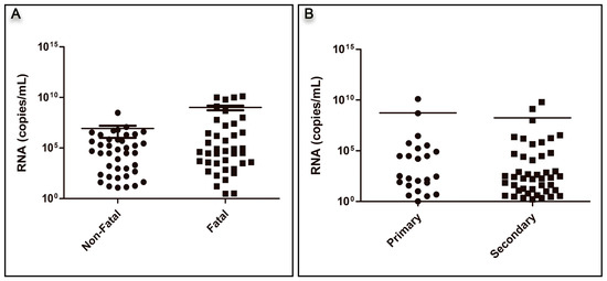 Regardless of the disease outcome, no difference was also observed when the viremia from primary cases was compared to that from secondary ones (Figure 2B). On the other hand, the viremia levels were higher in fatal cases from both primary and secondary infections (Figure 2C,D). Tricou [20] observed that the peak in viremia was significantly observed less frequently during secondary than primary infections for all disease outcomes. In contrast, Perdomo-Celis [41] observed that viremia of primary infections was higher than in patients with secondary infections.