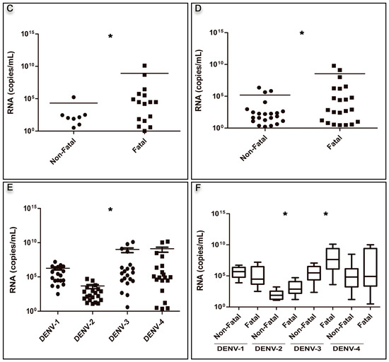 RNA viral load quantification by qRT-PCR (A) according to the disease outcome (non-fatal: n = 40; fatal: n = 40) p = 0.06 by using t test; (B) by type of infection (primary: n = 24 versus secondary: n = 45) using t test; (C) in primary non-fatal (n = 8) versus fatal (n = 16) cases, * p < 0.01 using t test; (D) in secondary non-fatal (n = 23) versus fatal (n = 22) cases, * p < 0.01 using t test; (E) in the analysis of DENV serotype regardless of the disease outcome (n = 80), * p < 0.01 by ANOVA test; (F) in the analysis of the distinct DENV serotypes according to the disease outcome (fatal: n = 10 and non-fatal/serotype) using t test. For DENV-2 fatal versus non-fatal cases, * p < 0.01, and for DENV-3 fatal versus non-fatal cases, * p < 0.01.