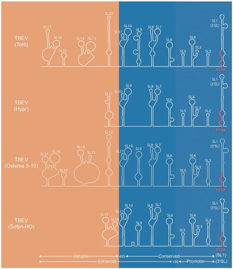- Sakai, M.; Yoshii, K.; Sunden, Y.; Yokozawa, K.; Hirano, M.; Kariwa, H. Variable region of the 3′ UTR is a critical virulence factor in the Far-Eastern subtype of tick-borne encephalitis virus in a mouse model. J. Gen. Virol 2014, 95 Pt 4, 823–835. [Google Scholar] [CrossRef] [PubMed]