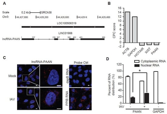 The human lncRNA-PAAN gene (LOC100506319) is located on chromosome 3p21.31, intergenic to the two coding genes TCAIM and ZNF445, with distances of 15 kb and 10 kb, respectively. LncRNA-PAAN is encoded by 4 exons (866 nt, https://www.ncbi.nlm.nih.gov/gene/? term = LINC01988) (Figure 1A). We first analyzed the theoretical coding potential of both isoforms using the Coding Potential Calculator (CPC) program. Results in Figure 1B show that the CPC score for lncRNA-PAAN is −0.980, which is in a range similar to that obtained for the validated lncRNA HOTAIR (−1.187) and XIST (−0.945). In contrast, the CPC scores for the coding genes ACTB (actin beta) and GAPDH are 14.242 and 12.007, respectively. These data suggest that lncRNA-PAAN lacks coding potential. qRT-PCR quantification analysis showed 29 ± 6.2 molecules per cell of lncRNA-PAAN in HEK293T cells. Next, we determined the subcellular localization of lncRNA-PAAN by performing RNA fluorescence in situ hybridization (FISH) and fractionation analysis. The results showed that lncRNA-PAAN was primarily localized in the cytoplasm in both IAV-infected and uninfected cells, while IAV infection resulted in an approximate 60% increase in the proportion in the nuclei to total lncRNA-PAAN (Figure 1C,D). Together, these results suggested that lncRNA-PAAN was predominantly localized in the cytoplasm and IAV infection promoted its nuclear localization.