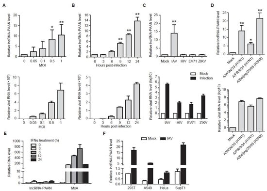 We next examined whether IAV infection affects the expression of lncRNA-PAAN. To this end, HEK293T cells were infected with IAV of different MOIs. The levels of lncRNA-PAAN were determined by qRT-PCR. The results showed that both lncRNA-PAAN (Figure 2A, upper panel) and viral RNA (Figure 2A, lower panel) were upregulated in an IAV dose-dependent manner, with 10-fold increase at the highest MOI infection. Moreover, results of time-course IAV infections showed that lncRNA-PAAN expression already increased at 3 h post-infection, and its level continued to rise with the progression of IAV infection (Figure 2B). Besides influenza A/WSN/33 virus shown in Figure 2A,B, the infections of other IAV stains including A/Beijing/30/95 (H3N2) isolate and A/PR/8/34 (H1N1) also significantly induced the expression of lncRNA-PAAN (Figure 2D). However, the level of lncRNA-PAAN did not change upon infection of VSV-G pseudotyped HIV-1, EV71 or Zika virus (Figure 2C, upper panel), whose replications were determined by qRT-PCR quantification of viral RNA (Figure 2C, lower panel). In addition, IFN-α did not affect lncRNA-PAAN expression, although MxA expression was drastically stimulated (Figure 2E). We further measured the relative abundance of lncRNA-PAAN in several human cell lines, including HEK293T, SupT1 and HeLa cells and observed lncRNA-PAAN expression in all these cell lines, with higher levels in HEK293T and SupT1 cells. Importantly, lncRNA-PAAN expression was profoundly elevated by IAV infection in HEK293T, A549 and SupT1 cells, with moderate increase in HeLa cells which are less permissive to IAV infection [] (Figure 2F). Together, these data together demonstrate that IAV infection specifically up-regulates the expression of lncRNA-PAAN.