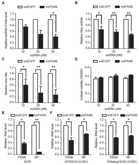 Downregulation of lncRNA-PAAN inhibits IAV replication. (A–C) HEK293T-Gluc cells were transfected with the indicated amounts of either esiPAAN or control esiEGFP for 48 h, followed by infection with IAV (MOI = 0.5) for 24 h. Levels of lncRNA-PAAN were quantified by qRT-PCR and GAPDH mRNA levels were used to normalize the levels of lncRNA-PAAN (A). Viral infectivity was determined by measuring Gluc activity (B) and infectious titers of progeny IAV in supernatants were determined by performing the TCID50 assay (shown in (C)); (A–C) data are normalized to control group, with the value of control arbitrarily set as 1; (D) HEK293T cells were transfected with the indicated amounts of esiPAAN or esiEGFP for 48 h. Cell viability was determined by performing the CCK8 assay; (E) A549 cells were transfected with either esiPAAN or control esiEGFP (40 nM) for 24 h, followed by infection with IAV (MOI = 0.5) for 36 h. Levels of lncRNA-PAAN and viral RNA were determined by qRT-PCR; (F) HEK293T cells were transfected with either esiPAAN or control esiEGFP (20 nM) for 36 h, followed by infection with A/PR/8/34(H1N1) or A/Beijing/30/95(H3N2) (MOI = 0.5) for 24 h. Levels of PAAN RNA and viral RNA were determined by qRT-PCR; (G) HEK293T cells were transfected with either siPAAN or negative control siRNA (50 nM) for 36 h, followed by infection with IAV (MOI = 0.5) for 24 h. Levels of PAAN RNA and viral RNA were determined by qRT-PCR; (H) HeLa and HEK293T cells were transfected with plasmid DNA expressing lncRNA-PAAN or empty vector (EV) for 24 h and infected with IAV (MOI = 0.5) for 36 h. The levels of lncRNA-PAAN and viral RNA were quantified by qRT-PCR; In (E–H) data, the level of GAPDH mRNA was also determined and used as the internal control to normalize the level of lncRNA-PAAN, and results are normalized to the values of the control, with the value of the control arbitrarily set as 1. IAV means the WSN strain unless otherwise specified. *: p ≤ 0.05; **: p ≤ 0.01.