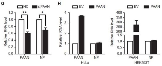 Cross-linked RIP was performed as previously reported []. In brief, the cells were fixed in 1% formaldehyde in PBS for 10 min and lysed by lysis buffer (50 mM HEPES, pH 7.5, 400 mM NaCl, 1 mM EDTA, 1 mM DTT, 0.5% Triton X-100, 10% Glycerol) with sonication (10 pulses for 10 s). Immunoprecipitation was performed overnight at 4 °C using IgG or anti-PA antibody. After washing five times with lysis buffer, the complex was reverse cross-linked at 70 °C, and RNA was extracted with Trizol LS. The levels of lncRNA-PAAN and GAPDH were detected by qRT-PCR.