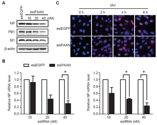 Next, we analyzed the effect of lncRNA-PAAN silencing on the expression of viral proteins and viral RNA in IAV infected cells. The results of western blots showed that the levels of viral protein NP, PB1 and M1 gradually declined with increasing amounts of esiPAAN transfected (Figure 4A). We also observed that levels of both vRNA and mRNA of NP reduced by approximately 70% in the lncRNA-PAAN knockdown cells, compared to that in the control cells (Figure 4B). These data suggest that lncRNA-PAAN is required for the expression of viral RNA and viral proteins. In addition, we examined the effect of lncRNA-PAAN knockdown on IAV entry and post-entry by monitoring the nuclear entry of viral RNP, and observed no significant change (Figure 4C), which further supports the role of lncRNA-PAAN in the later stage of IAV infection including viral RNA transcription and replication.