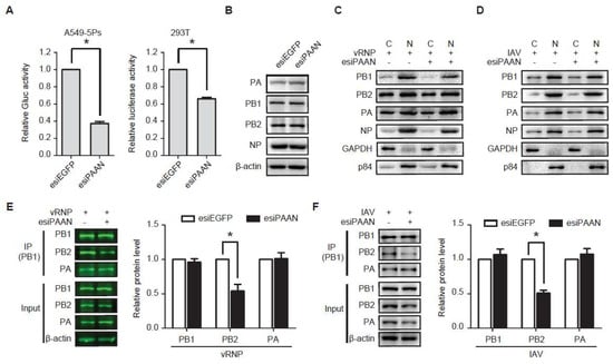 LncRNA-PAAN knockdown impairs PB1-PB2 association and the RdRp activity. (A) Gluc activities were determined in A549-5Ps cells that were transfected with esiPAAN or esiEGFP (left panel). Luciferase activities were measured in HEK293T cells that were transfected with esiPAAN or esiEGFP, followed by co-transfection of RNP reconstitution plasmids (PB1, PB2, PA, NP) and the reporter plasmid used to transcribe an IAV-like RNA (right panel); (B) A549-5Ps cells were transfected with esiPAAN or esiEGFP. Levels of viral PA, PB1, PB2 and NP protein were determined by western blotting; (C,D) HEK293T cells were transfected with esiEGFP or esiPAAN, followed by co-transfection of plasmid DNA encoding vRNP subunits (PB1, PB2, PA, NP and PolI-luc) (C), or infection with IAV (MOI = 0.5) for 24 h (D). Levels of viral PA, PB1, PB2 and NP in cytoplasm and nuclei were analyzed by western blotting. The GAPDH protein was used as a cytoplasmic marker, and p84 protein as a nuclear marker. (E and F) HEK293T cells were transfected with esiEGFP or esiPAAN, followed by co-transfection of plasmid DNA encoding vRNP subunits (E), or infection with IAV (MOI = 0.5) for 24 h (F). Cell lysates were immunoprecipitated with anti-PB1 antibody. The inputs and the PB1-immunoprecipitated samples were analyzed by western blotting with the indicated antibodies. The intensity of protein band was determined using the Odyssey infrared imaging system (E) and Image J program (F). Right panel represents relative levels of PB1, PB2 and PA in the immunoprecipitated samples, which were calculated by normalization to control groups. IAV means the WSN strain unless otherwise specified. *: p ≤ 0.05.