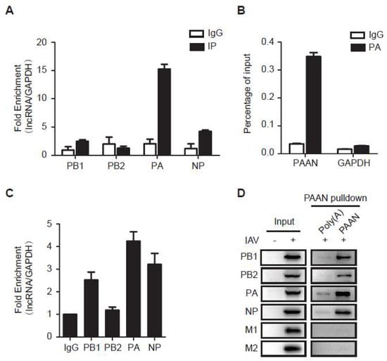 In addition, the association of lncRNA-PAAN and IAV proteins in IAV-infected cells was assessed using RIP assay. The result showed the most significant enrichment of lncRNA-PAAN in the PA-immunoprecipitated sample in IAV-infected cells, and relative less enrichment of lncRNA-PAAN with PB1 and NP (Figure 6C). We further validated the interaction between lncRNA-PAAN and IAV proteins by performing RNA pull-down experiments using IAV-infected cell lysates. After incubating biotinylated lncRNA-PAAN probe with whole cell extracts, the RNA pulldown samples were analyzed by western blotting with the indicated antibodies. As shown in Figure 6D, the components of the viral RNP complex including PA, PB1, PB2 and NP, not M1 and M2 protein, was specifically precipitated with lncRNA-PAAN. Notably, PA is the most abundant one found in the RNA pull-down samples, and the enrichment of viral proteins co-precipitated with lncRNA-PAAN is similar to what we found in RIP analysis. Taken together, these data suggest preferable association of lncRNA-PAAN with IAV PA protein.