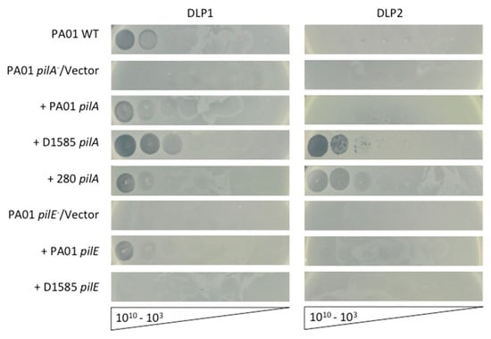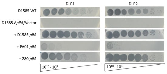 Assessment of the phage plaquing ability on the constructed D1585 ΔpilA mutant by spot assay shows that the mutant is resistant to infection by DLP1 and DLP2, displaying an absence of clearing and cell lysis at high phage titer (Figure 4). Complementation of the mutant with the endogenous D1585 pilA gene restored infection by DLP1 and DLP2 to wildtype levels, each producing plaques at 103 PFU/mL, as expected for type IV pili-specific bacteriophages. Transformation of D1585 ΔpilA with an empty pBBR1MCS vector did not restore phage infection and no change in bacterial growth in each phage spot was observed. In contrast to the original characterization of DLP1 by Peters et al. (2015) [], high titer phage stocks of 1010 PFU/mL were able to clear the bacterial lawn and plaque formation was no longer delayed. We suspect that the efficiency of DLP1 infection has increased since its original isolation due to repeated propagation on the S. maltophilia host D1585 under laboratory conditions. These results confirm the identification of the type IV pilus as the primary receptor for DLP1 and DLP2 infection of their shared host, D1585. Because DLP1 can infect both D1585 and PA01 via adherence to the type IV pilus, we hypothesized that expression of the exogenous PA01 pilA gene in our D1585 ΔpilA mutant should restore DLP1 binding and infection, similar to the reverse situation as described above. As expected, cross-genera complementation of the D1585 ΔpilA mutant with the cloned PA01 pilA gene produced less efficient DLP1 infection, forming plaques when spotted with 107 PFU/mL DLP1 (Figure 4). Surprisingly, DLP2 was also capable of low-level infection of D1585 ΔpilA expressing the PA01 major pilin subunit; DLP2 produced plaques at 109 PFU/mL, approximately 102-fold lower efficiency than DLP1. While DLP2 is unable to infect wildtype PA01, it is possible that the PA01 PilA subunit folds differently in D1585 to expose different phage binding sites and enable low levels of DLP2 infection. Alternatively, PA01 PilA may interact with the pilus priming minor pilin subunits of D1585 as efficiently as the endogenous major subunit, perhaps permitting DLP2 to recognize the pili via the minor pilins and reach a surface secondary receptor for partial infection. Twitching motility analysis of the complemented D1585 mutant yielded no changes in motility compared to the low levels observed in wildtype D1585.