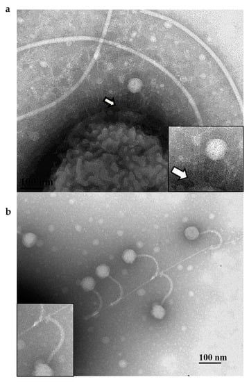 - Bradley, D.E. A pilus-dependent Pseudomonas aeruginosa bacteriophage with a long noncontractile tail. Virology 1973, 51, 489–492. [Google Scholar] [CrossRef]