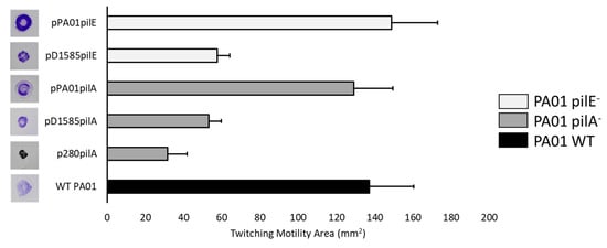Twitching motility assays were used as an indirect measurement of type IV pili function. A single bacterial colony was suspended in 100 μL LB broth and stab inoculated with a toothpick through a 3 mm thick LB agar layer (1% agar), containing 0.3% porcine mucin or antibiotic where indicated, to the bottom of the petri dish and incubated with humidity at 37 °C for 24 h for PA01 [] or 72 h for D1585 []. Twitching motility zones between the agar and petri dish interface were visualized by gently removing the agar and staining each plate with 1% (w/v) crystal violet for 30 min followed by rinsing excess stain away with water. Stained twitching zone areas were measured using ImageJ software (NIH, Bethesda, MD, USA) []. Each strain was tested in biological and technical triplicate and average twitching area was calculated from the nine twitching zones.