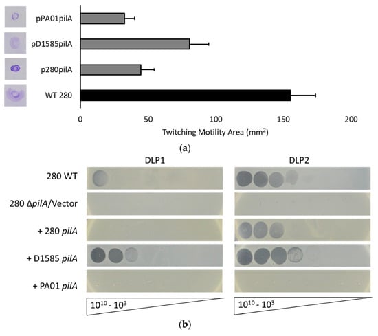 Similar to cross-genera complementation of the PA01 pilA mutant with the D1585 pilA gene, expression of the exogenous D1585 pilA gene in our 280 ΔpilA mutant permitted infection by DLP2 as well as DLP1, plaquing at 105 PFU/mL and 108 PFU/mL respectively (Figure 5b). The reverse complementation of D1585 ΔpilA with the 280 pilA also restores DLP1 and DLP2 infection to near wildtype levels, with DLP2 infecting more efficiently (Figure 4, Table 3). Cross-genera complementation of 280 ΔpilA with the P. aeruginosa PA01 pilA gene did not restore infection by either DLP1 or DLP2. This is contrary to the reverse complementation of PA01 pilA mutants with the 280 pilA gene that shows partial infection by DLP2 as well as DLP1 (Figure 1, Table 3). These observations suggest that the P. aeruginosa PA01 PilA subunit does not assemble proficiently with the S. maltophilia 280 type IV pili machinery, whereas the more closely related D1585 PilA subunit can be assembled correctly to allow pili function and phage infection. The amino acid sequence identity between 280 and PA01 PilA subunits is lower than 280 and D1585 PilA, sharing 48% and 67% sequence identity respectively. Additionally, the twitching motility zone of 280 ΔpilA carrying pPA01pilA is reduced by 80% relative to wildtype 280, compared to complementation with the D1585 or endogenous pilA gene restoring twitching motility to 52% and 29% of wildtype respectively (Figure 5a).