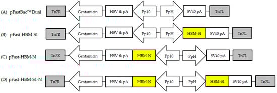 Schematic diagram of S1, N and S1-N genes baculovirus expression systems. (A) The schematic diagram of the transfer vector pFastBacTM Dual; (B) The HBM-S1 gene was sub cloned into the vector pFastBacTM Dual under the control of PH promotor; (C) The HBM-N gene was sub cloned into the vector pFastBacTM Dual under the control of P10 promotor; (D) HBM-S1 and HBM-N genes were sub cloned into the vector pFastBacTM Dual under the control of PH and P10 promotors, respectively. The resulting recombinant transposon vectors were named pFast-HBM-S1, pFast-HBM-N and pFast-HBM-S1-N.
