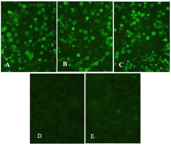 Detection of the recombinant proteins’ expression using indirect immunofluorescence assay (IFA) (200×). Sf9 cells were infected with recombinant baculoviruses at a multiplicity of infection (MOI) of 5 and detected by fluorescence microscopy 72 h post-infection. (A) Sf9 cells infected with baculovirus rHBM-S1; (B) Sf9 cells infected with baculovirus rHBM-N; (C) Sf9 cells infected with baculovirus rHBM-S1-N; (D) Sf9 cells infected with wild-type baculovirus; (E) Normal Sf9 cells.
