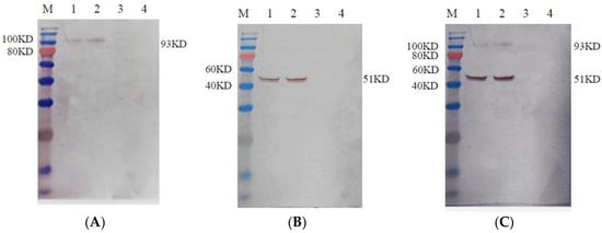 Detection of the recombinant proteins’ expression using Western blot. Sf9 cells were infected with recombinant baculovirus at a MOI of 5. The recombinant proteins were detected 72 h post-infection. (A) The recombinant proteins expressed by baculovirus rHBM-S1; (B) The recombinant proteins expressed by baculovirus rHBM-N; (C) The recombinant proteins expressed by baculovirus rHBM-S1-N. Lane M. Blue Plus IV Protein Marker; Lane 1 culture supernatant; Lane 2 cell lysate; Lane 3 wild-type baculovirus; Lane 4 normal Sf9 cells.