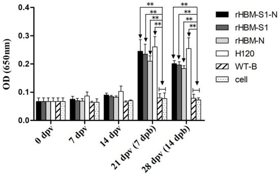 At 14 dpv, IBV-specific antibody levels in birds immunized with subunit vaccines rHBM-S1-N, rHBM-S1, rHBM-N and inactivated vaccine strain H120 started to rise (p > 0.05). The antibody levels of the vaccinated groups increased notably at 21 and 28 dpv (i.e., 7 and 14 dpb) and were significantly higher than those of the negative control groups (p < 0.01) (Figure 4). The highest IBV antibodies in each vaccinated group were observed at 7 dpb. The antibody levels in the rHBM-S1-N group were always higher than those in the rHBM-S1 and rHBM-N groups but the difference was not significant (p > 0.05). Similarly, the antibody titers in rHBM-S1 groups were always slightly higher than those in the rHBM-N group (p > 0.05). Chickens in the H120 group developed the highest antibody titers throughout the experimental period but the difference was not significant (p > 0.05) compared with those in the rHBM-S1-N, rHBM-S1 and rHBM-N groups.