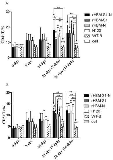 The results showed that the percentages of CD4+ and CD8+ T lymphocytes in vaccinated birds were rising at 7 dpv (Figure 5). At 21 and 28 dpv (i.e., 7 and 14 dpb), the percentages of CD4+ and CD8+ T lymphocytes in the rHBM-S1-N and rHBM-N groups were significantly higher than those of the negative groups (p < 0.01). The percentages of CD4+ T lymphocytes in the rHBM-S1 group were significantly higher than those of the negative controls (p < 0.05) and the percentages of CD8+ T lymphocytes were significantly higher (p < 0.01) compared with the negative controls. Based on percentages of CD4+ and CD8+ T lymphocytes in the vaccinated groups at 21 and 28 dpv (i.e., 7 and 14 dpb), the groups sorted from highest to lowest as follows: the rHBM-S1-N group, the rHBM-N group, the H120 group and the rHBM-S1 group. There was a significant difference between the rHBM-S1-N and rHBM-S1 groups (p < 0.05), while no significant difference was noted between other groups (p > 0.05).