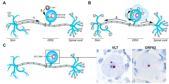 Two non-mutually exclusive routes by which VZV may infect sensory ganglion neurons have been proposed (Figure 2A). First, VZV could enter nerve endings innervating the dermis at sites of cutaneous lesions and gain access to ganglia by retrograde axonal transport. This route is supported by the detection of viral antigens in Schwann cells and peripheral nerve axons in the dermis of varicella patients [], and observations that HZ occurs at the site of varicella vaccine inoculation [] or the sites most affected by varicella []. More recently, VZV infection of axons and retrograde axonal transport to neuronal cell bodies was formally demonstrated in cell culture [,], possibly involving fusion between VZV-infected non-neuronal cells and neuronal axons []. Notably, nerve endings are located in close proximity to the cutaneous vasculature at the dermal–epidermal junction and in hair follicles [], supporting a model in which VZV may concurrently infect epidermal or hair follicle keratinocytes and neurons via local cell-to-cell spread. Second, VZV-infected lymphocytes, most likely T-cells, could disseminate the virus to ganglia during varicella-associated viremia. This is supported by detection of VZV DNA in ganglia obtained at autopsy from patients in the prodromal stage of varicella []. Moreover, localized injection of live-attenuated VZV vaccine virus results in the establishment of viral latency in bilateral DRGs and enteric ganglia []. VZV infects T-cells, prolongs their survival via STAT3 phosphorylation and induction of survivin [], and modulates their phenotype to induce an activated skin-tropic memory T-cell [,,]. While the prerequisites for T-cell entry into ganglia are unknown, intravenously injected VZV-infected tonsillar T-cells have been shown to transfer the virus to human foetal DRG xenografts implanted under the kidney capsule in severe combined immunodeficiency (SCID) mice []. Moreover, T-cells infected with the simian varicella virus (SVV), the closest relative to VZV and natural cause of varicella and HZ in non-human primates, has been detected in the ganglia of non-human primates during primary infection []. Thus, the definitive route(s) by which VZV infects ganglionic neurons, with or without cutaneous innervation, needs to be investigated in future studies.