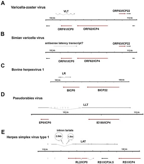 Comparison of latency-associated transcripts among alphaherpesviruses. All alphaherpesvirus latency-associated transcripts (LATs) are located antisense to the infected cell polypeptide 0 (ICP0) locus, encoding a conserved major immediate-early transactivator (ICP0 or homologs). (A) The VZV latency-associated transcript (VLT) is a 496-nucleotide, multi-exon mRNA that is partially antisense to the ORF61 coding region via exons 3 and 4. (B) Transcripts mapping antisense to simian varicella virus ORF61 are expressed during latency (dotted arrow), but their identity has not yet been defined. (C) Bovine herpesvirus 1 encodes a 2.2 kb latency-related (LR) RNA and encodes two miRNAs in exon 1 (D) The pseudorabies virus large latency transcript (LLT) is the largest characterized alphaherpesvirus latency transcript and encodes eleven distinct miRNAs within the spliced intron. (E) The 8.2 kb herpes simplex virus type 1 (HSV-1) LAT undergoes splicing which yields two highly stable intron lariats, approximately 1.5 and 2.0 kb in size (shown as circles). Note that latency transcripts are shown as grey arrows, immediate early viral transactivators as dark red arrows, and encoded miRNAs as short vertical lines. Scaling across all schematics is equal.